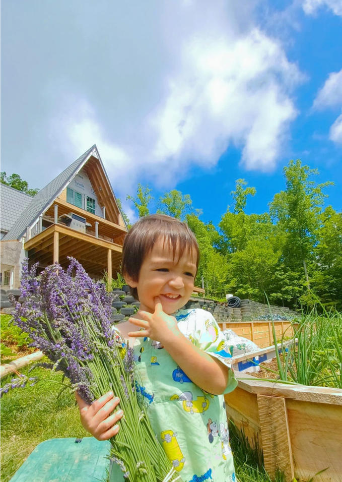Bé David, con của vợ chồng John và Nhi, 2,5 tuổi cùng mẹ thu hoạch lavender trước nhà ở thị trấn Crossville, bang Tennessee, cuối tháng 6/2023. Ảnh: Nhân vật cung cấp
