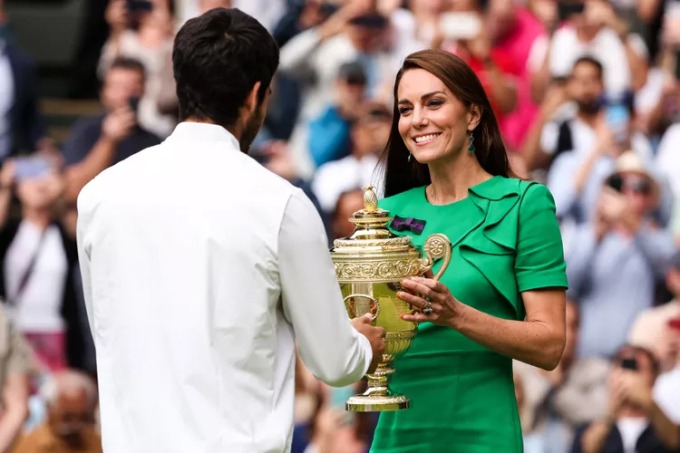Kate trao cup Wimbledon 2023 cho tay vợt người Tây Ban Nha Carlos Alcaraz. Ảnh: Shi Tang
