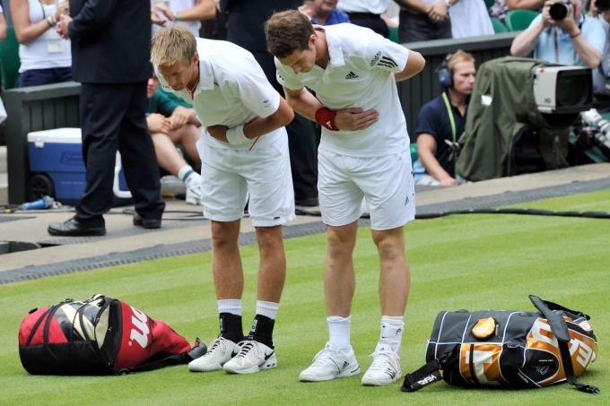 Andy Murray và Jarkko Nieminen cúi mình trước Nữ hoàng Elizabeth II ở Wimbledon 2010. Ảnh: David Ashdown