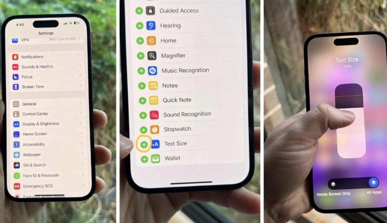 Đi tới ứng dụng Cài đặt, sau đó đến Trung tâm điều khiển, đây là khu vực đặt các phím tắt cho các tác vụ hoạt động cơ bản của điện thoại. Cuộn xuống ở mục “Điều khiển khác”, tìm Cỡ chữ và thêm bằng cách nhấn nút dấu cộng màu xanh lá cây bên cạnh.