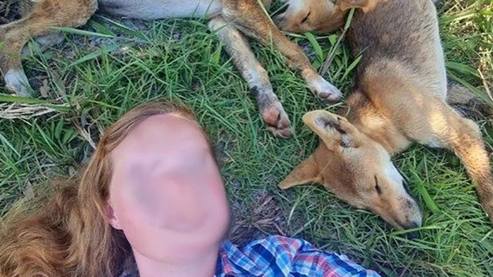 Cơ quan quản lý động vật hoang dã Queensland cho biết du khách này chụp ảnh tự sướng với những chú chó dingo con và thật may mắn khi mẹ của chúng không ở gần đó.
