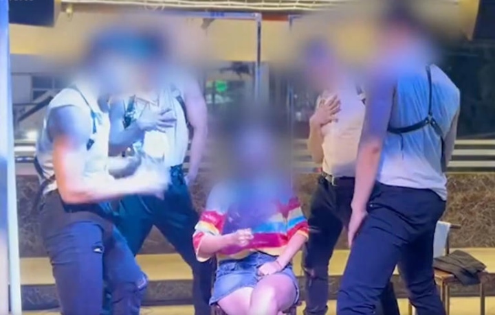 Các nam nhân viên vây xung quanh một khách nữ rồi nhảy những điệu nhẩy khiêu khích.