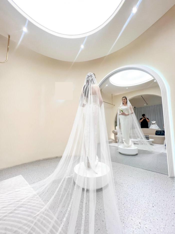 Nữ diễn viên sinh năm 1982 diện đầm quây cúp ngực màu trắng được đính các hạt đá nhỏ li ti. Bên cạnh đó, cô kết hợp thêm voan cô dâu dài tạo cảm giác sang chảnh.
