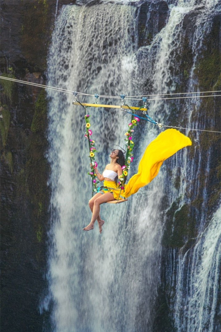 “Đứng tim” nhất phải kể đến trải nghiệm nằm võng. Ở hai trò chơi trước, du khách đều được cố định vào bàn ăn gỗ hay xích đu chắc chắn. Với hoạt động này, chiếc võng vải được kéo ra giữa thác và để đu đưa tự nhiên theo gió.