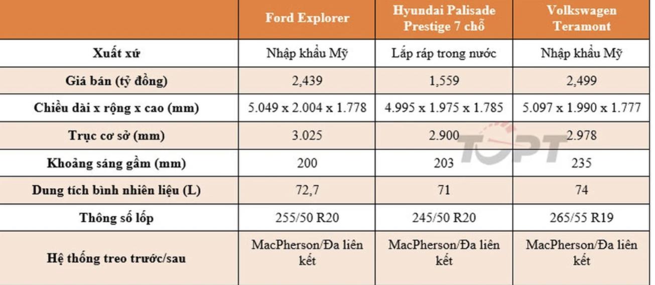 Theo đó, Hyundai Palisade Prestige 7 chỗ có được mức giá bán rẻ nhất trong phân khúc nhờ vào việc được lắp ráp trong nước (và được hưởng ưu đãi lệ phí trước bạ từ nay đến cuối năm), trong khi 2 đối thủ được nhập khẩu từ Mỹ, đặc biệt là mẫu xe Volkswagen với thương hiệu Đức nhưng cũng có xuất xứ tương tự Ford Explorer và phải chịu mức thuế nhập khẩu 70%.