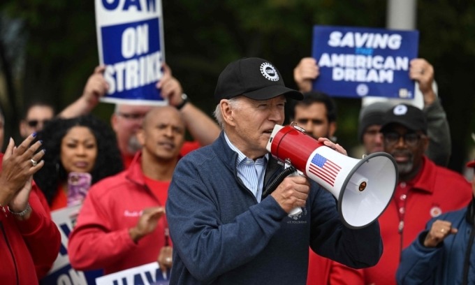 Tổng thống Mỹ Joe Biden hôm 26/9 đội mũ của công đoàn United Auto Workers (UAW) và dùng loa cầm tay nói với các nhân viên đang đình công và biểu tình ở Michigan rằng họ xứng đáng được hưởng nhiều hơn.