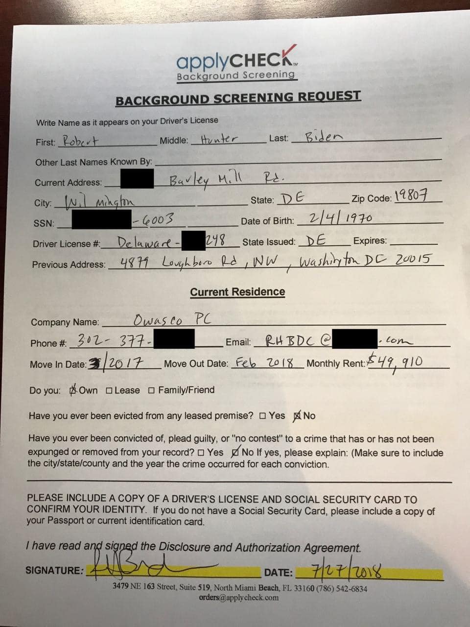 Người nhận tiền là Robert Hunter Biden với địa chỉ "1209 Barley Mill Rd." ở Wilmington, Delaware. Đây là địa chỉ nơi ở chính của ông Joe Biden.
