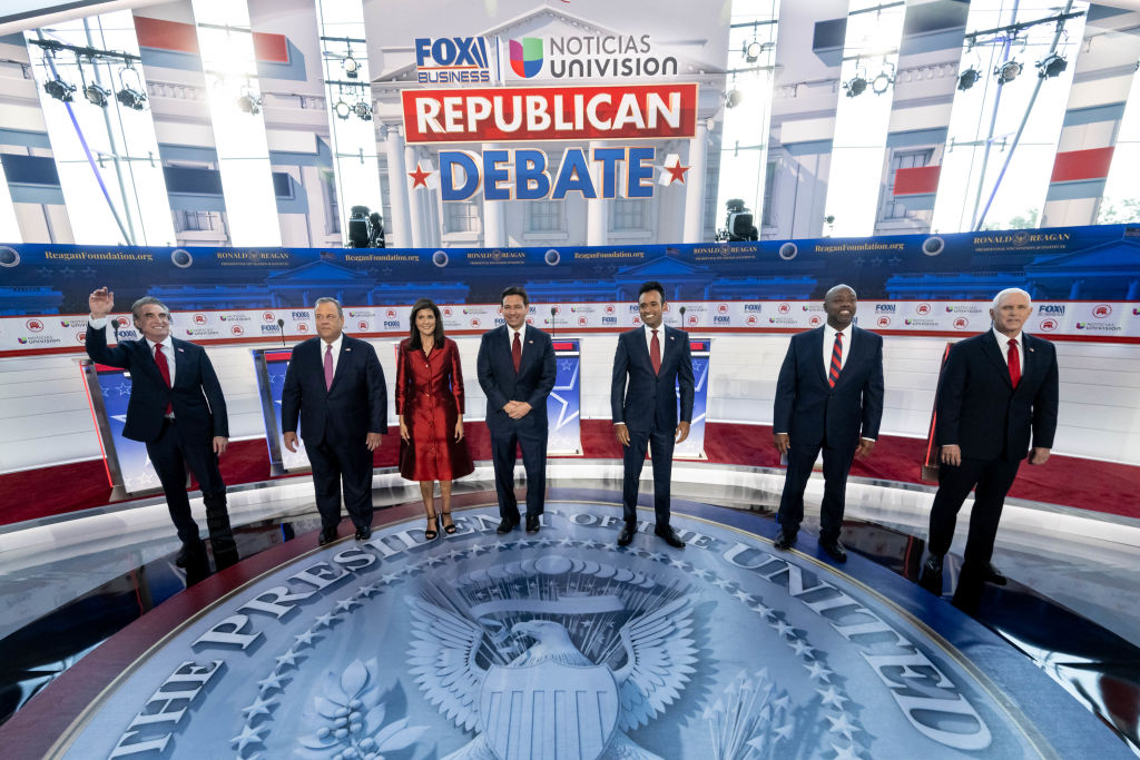 Các ứng cử viên trong cuộc tranh luận lần thứ hai ngày 27 Tháng Chín 2023: Doug Burgum, Chris Christie, Nikki Haley, Ron Desantis, Vivek Ramaswamy, Tim Scott, và Mike Pence (Ảnh: David Crane, Los Angeles Daily News/SCNG)