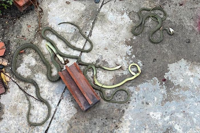 Qua kiểm tra, người thợ phát hiện có 4 con rắn màu xanh, không rõ chủng loại, đang bò lổm ngổm. Anh vội dùng kìm và các thiết bị, đứng từ xa kẹp rắn ra ngoài rồi giết chúng ngay dưới sàn nhà. "Hai loại rắn dễ chui vào điều hòa nhất là rắn lục và rắn ráo", anh nói.