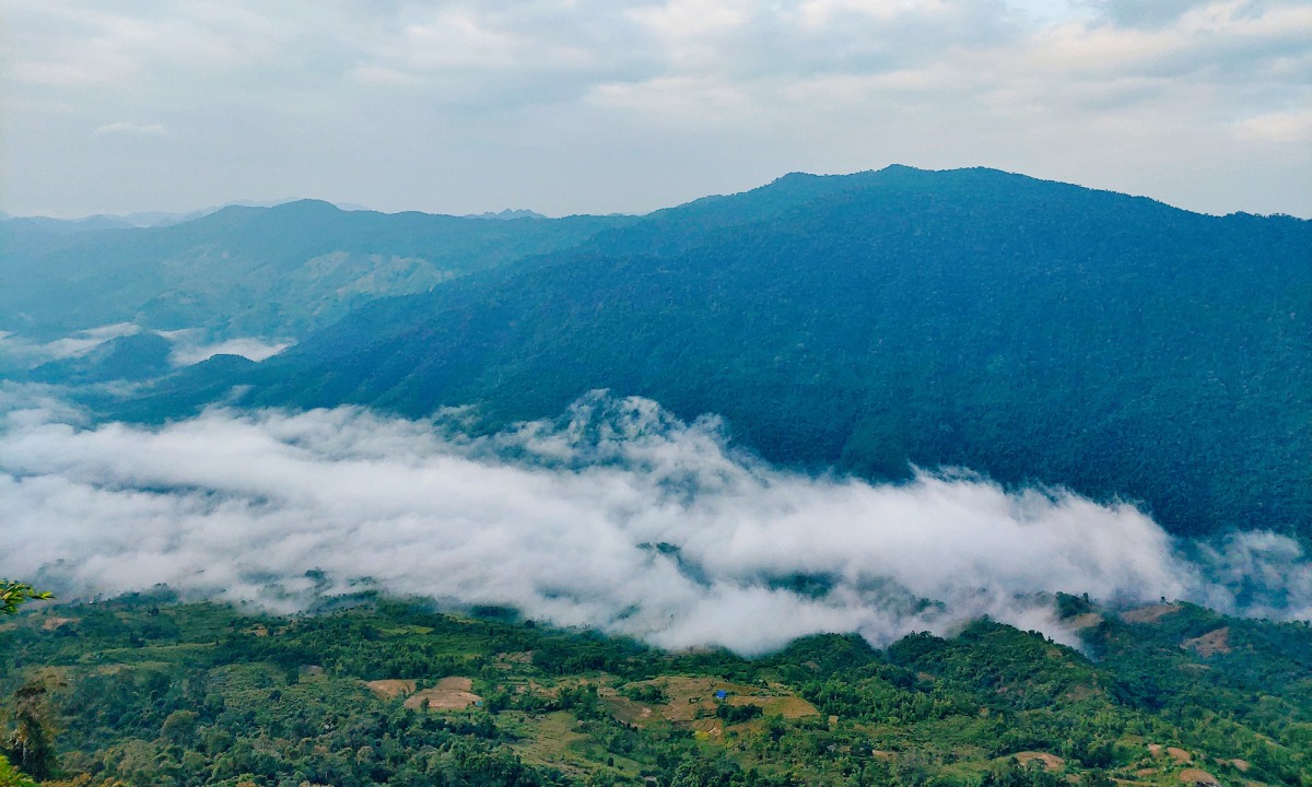 "Biển mây ở Hang Kia sẽ thấp hơn tầm nhìn nên có cảm giác như mình đang đứng trên mây", anh Tú nói. Những lớp mây nằm ở lưng chừng như tấm vải trắng của thiên nhiên căng giữa hai dãy núi, trải dài vô tận.