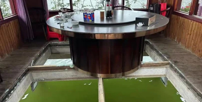 Theo hình ảnh được chụp tại nhà hàng, bàn ăn được đặt trên một cấu trúc hình chữ thập, trong khi phần ghế ngồi được đặt trên khoảng kính, phía dưới là hồ nước màu xanh. Sàn kính có dấu hiệu bị nứt.