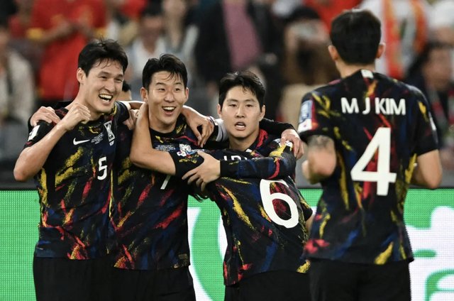 Các cầu thủ của Hàn Quốc là Park Yong-woo (trái), Son Heung-min (thứ hai bên trái), Hwang In-beom (giữa), Lee Kang-in (thứ hai bên phải) và Kim Min-jae (phải) ăn mừng sau khi ghi một bàn thắng trong giải đấu Ṿng loại FIFA World Cup AFC 2026 giữa Trung Quốc và Hàn Quốc, tại Thâm Quyến, tỉnh Quảng Đông, Trung Quốc, ngày 21/11/2023. (Ảnh: AFP qua Getty Images)