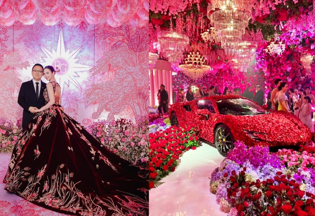 Theo Sohu, đám cưới được tổ chức tại Grand Ballrom The Westin, Surabaya, Indonesia. Lấy chủ đề "Tình yêu một đời", chủ nhân bữa tiệc chú trọng trang trí không gian bằng hoa và đèn chùm pha lê. Đặc biệt, những chiếc xe Ferrari sang trọng cũng được trang trí bằng hoa hồng (Ảnh: @Gwen_ashley).