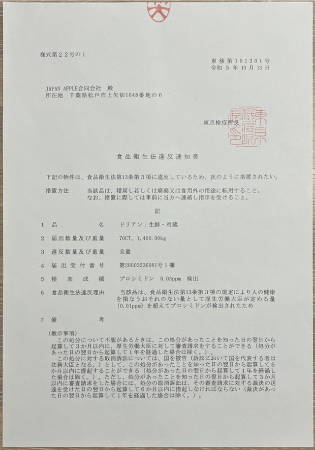 Văn bản thông báo từ cơ quan kiểm dịch Nhật Bản về lô sầu riêng 1,4 tấn nhập khẩu từ Việt Nam tồn dư thuốc bảo vệ thực vật