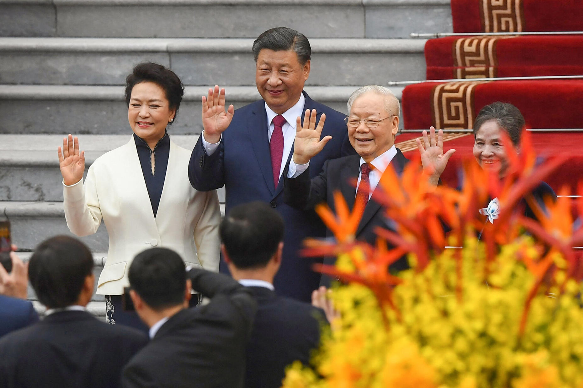 Vợ chồng ông Tập Cận Bình (trái), tổng bí thư kiêm chủ tịch Trung Quốc, và vợ chồng ông Nguyễn Phú Trọng, tổng bí thư đảng CSVN. (Hình: Nhac Nguyen/Pool/AFP via Getty Images)