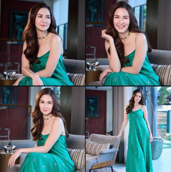 Marian Rivera đăng tải loạt ảnh quảng cáo sản phẩm mới gây chú ý trên MXH. Người đẹp diện thiết kế váy lụa màu xanh dáng suông cùng họa tiết hình sao biển bắt mắt. Để tổng thể có điểm nhấn, cô phối cùng dây chuyền tone sur tone với trang phục đến từ thương hiệu Gucci.