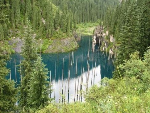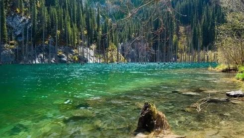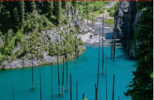 Ở hồ Kaindy, dưới đáy hồ, lá cây vẫn mọc xanh tốt, nhưng ở trên mặt nước lại trơ trọi như những cây cọc khô héo được cắm xuống, tạo nên một bức chân dung hấp dẫn đối với những người tò mò ưa mạo hiểm.