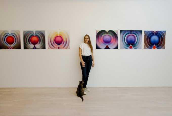 Họa sĩ Loie Hollowell bên các tác phẩm. Ảnh: W Magazine