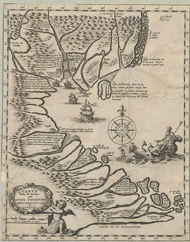 Bản đồ do Daniel Tavernier vẽ tại chỗ và một số chuyến hành trình ông thực hiện tại Bắc bộ. Bản đồ minh họa cho thấy bờ biển phía bắc của Việt Nam với đồng bằng châu thổ