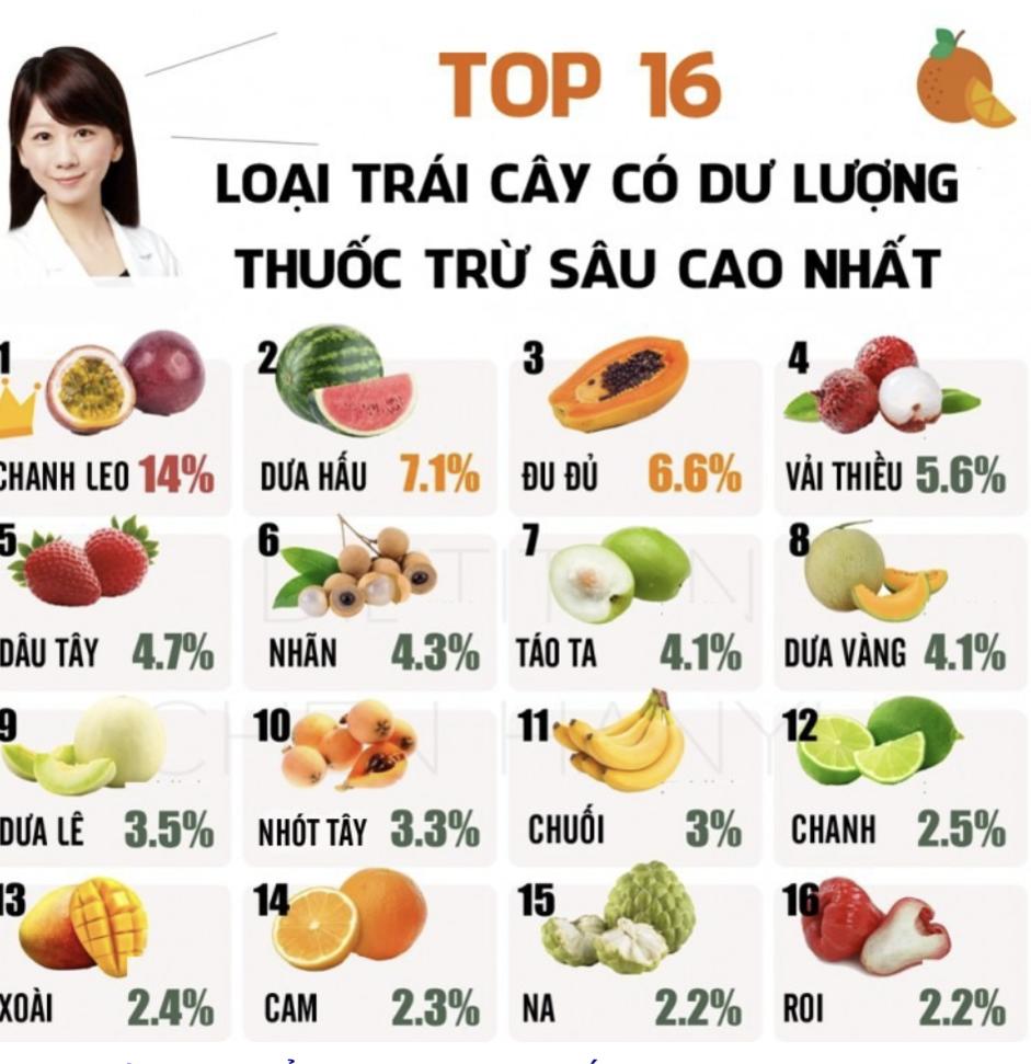 Theo Phụ nữ & Pháp luật đưa tin, chuyên gia dinh dưỡng người Đài Loan (Trung Quốc) Cheng Hanyu mới đây đã tổng hợp bảng xếp hạng mới nhất về 16 loại trái cây có tỷ lệ dư lượng thuốc trừ sâu cao nhất dựa trên kiểm tra của Bộ Nông Nghiệp. Theo Báo cáo nghiên cứu giám sát dư lượng thuốc trừ sâu hàng năm về trái cây và sản phẩm nông nghiệp của Bộ Nông nghiệp Đài Loan, trong số 4.119 loại trái cây được thử nghiệm, loại trái cây có tỷ lệ dư lượng thuốc trừ sâu cao nhất là chanh leo, riêng dâu tây thường hay bị mang tiếng "bẩn" nhất thì xếp ở vị trí số 5.