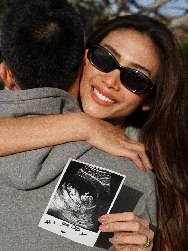 Siêu mẫu tiết lộ, khi em bé được 9 tuần tuổi, cô gửi ảnh siêu âm cho chồng xem: "Khi biết có em bé hiện hữu trong bụng mình rồi, chắc chắn rồi, tôi báo ông xã biết tin vui nhưng mà anh cứ bị 'đơ' rất buồn cười. Chưa bao giờ làm ba, chưa hiểu cảm giác làm ba thế nào nên anh bị lâng lâng không diễn tả được cảm xúc".