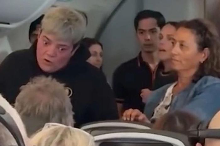 Đoạn clip do hành khách trên chuyến bay chia sẻ với 9News cho thấy người phụ nữ có đôi mắt hung dữ, mái tóc ngắn màu vàng, hét vào mặt hành khách nam đang ngồi. Sự việc xảy ra khiến những người khác ngơ ngác, kinh ngạc.