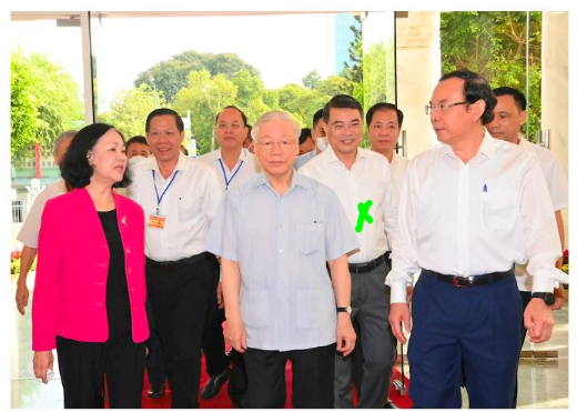 Bản tin trên website của Đảng bộ TP HCM cho thấy ông Trọng đi cùng bà Trương Thị Mai (áo đỏ), ông Lê Minh Hưng (dấu X màu xanh).