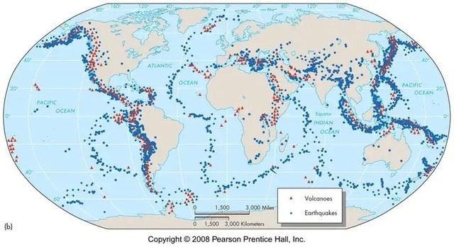 Bản đồ phân bố các vùng địa chấn và vùng núi lửa trên Trái Đất, trong đó có nhiều khu vực đông dân cư. Những nơi này sẽ xảy ra động đất và núi lửa siêu mạnh và về cơ bản loài người sẽ bị hủy diệt nếu như không có Mặt Trăng.