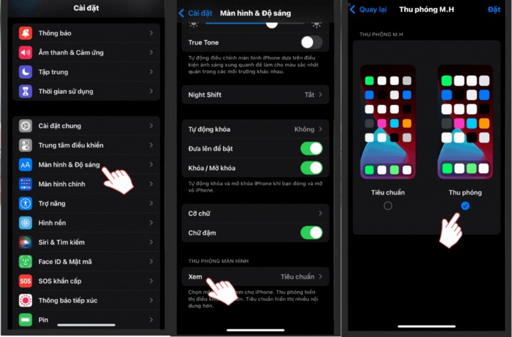 Bước 1: Bạn truy cập vào "Cài đặt" chọn "Màn hình & Độ sáng", nhấn chọn vào "Xem tại Thu phóng màn hình"chọn "Thu phóng"