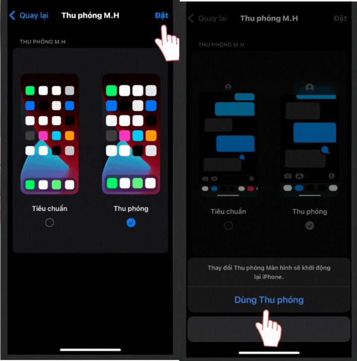 Bước 2: Bạn nhấn chọn "Đặt" chọn "Dùng Thu phóng" để tăng kích thước các biểu tượng ứng dụng trên giao diện chính.