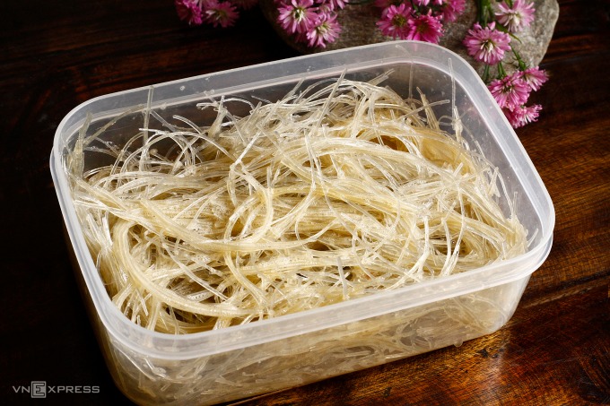 Miến sau khi ngâm vớt ra để rổ thưa cho ráo nước rồi cắt đoạn vừa ăn. Sau đó cho vào âu, đập hai quả trứng gà vào, trộn đều cùng với miến.