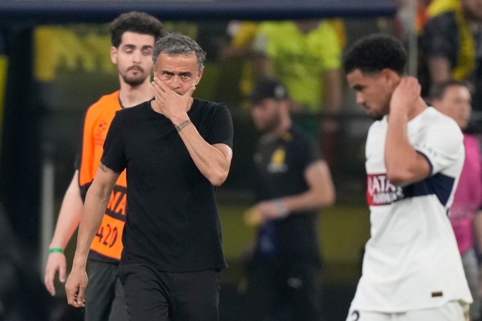 Enrique (áo đen) thất vọng sau trận PSG thua Dortmund 0-1 ở bán kết lượt đi Champions League tối 1/5 trên sân Signal Iduna Park. Ảnh: AP
