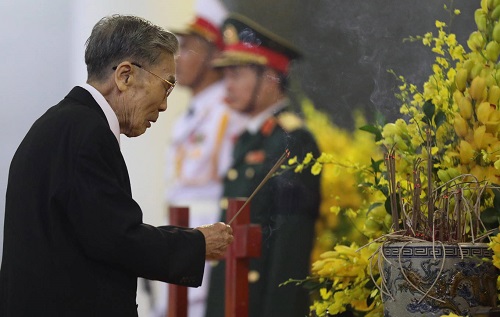 ̣93 tuổi, cựu tù chính trị nhà tù Hỏa Lò Tạ Quốc Bảo (Tạ Sinh Nhạ) run run thắp nén nhang trước linh cữu nguyên Tổng bí thư. Sinh ra trong gia đình nhà nho yêu nước ở xã Đông Hội (Đông Anh, Hà Nội), ông Bảo sớm giác ngộ cách mạng, trở thành liên lạc của Xứ ủy Bắc Kỳ năm 1941-1942.