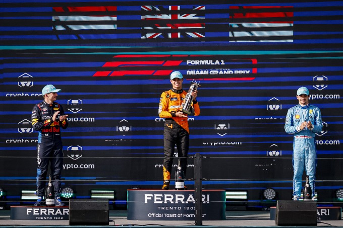 Tay đua Lando Norris (giữa) trở thành nhà vô địch F1 Miami Grand Prix hôm 5/5. Ảnh: AFP