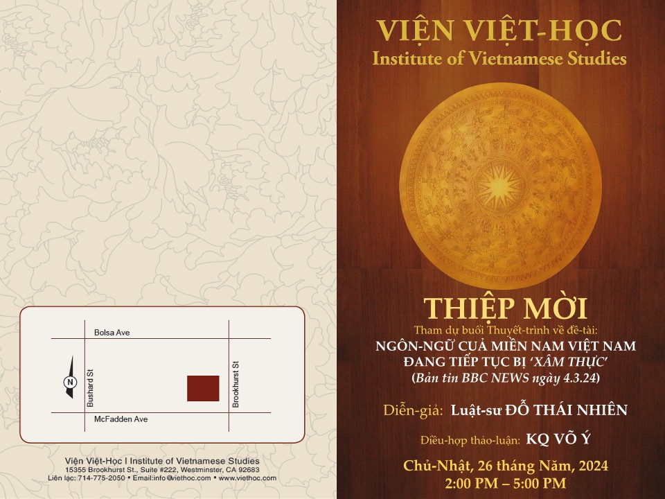 Viện Việt học gửi thiệp mời tham dự buổi thuyết trình của Luật sư Đỗ Thái Nhiên về đề tài “Ngôn ngữ của Miền Nam Việt Nam đang tiếp tục bị xâm thực”. Sự kiện diễn ra từ 2 đến 5 giờ chiều Chủ Nhật, 26 tháng 5 tại Viện Việt học, số 5355 Brookhurst St., Suite R222, Westminster, CA. Luật sư Đỗ Thái Nhiên cùng với người điều hợp thảo luận là Võ Ý nói về đề tài được đăng trên bảng tin BBC News ngày 4 tháng 3. Sau lời chào mừng cũng như giới thiệu tác giả, ban tổ chức, sẽ là phần thuyết trình với 3 phần. Phần đầu nói về tin tức hiện tại về ngôn ngữ địa phương Việt Nam bị xâm thực; Phần 2 là nhận định của tác giả; Và phần 3 sẽ nói về Người Việt Hải ngoại nghĩ và làm gì trước việc này. Xen giữa các phần sẽ là văn nghệ gồm các nhạc phẩm như Tình Ca (Phạm Duy), Hội Trùng Dương (Phạm Đình Chương) và bà Ái Phương sẽ trình bày vài phương ngữ qua ca dao Việt Nam. Đến 3 giờ 30 sẽ là phiên thảo luận điều hợp cùng ông Võ Ý và cuối cùng là lời cảm tạ. Về ông Nhiên, ông sanh năm 1943 tại Quận Nhất, Sài Gòn. Ông là cựu luật sư Tòa Thượng Thẩm Saigon, cựu Sĩ quan tổng quản Bộ tổng tham mưu QLVNCH. Sau 30/4/1975, ông bị bắt và trở thành tù nhân chính trị, nhưng ông đã vượt biên và định cư tại Hoa Kỳ vào tháng 2 năm 1986. Các sách đã xuất bản bao gồm Triết học Lý Đông A; Một quan niệm chung cho nhân quyền; Vận động hòa bình.