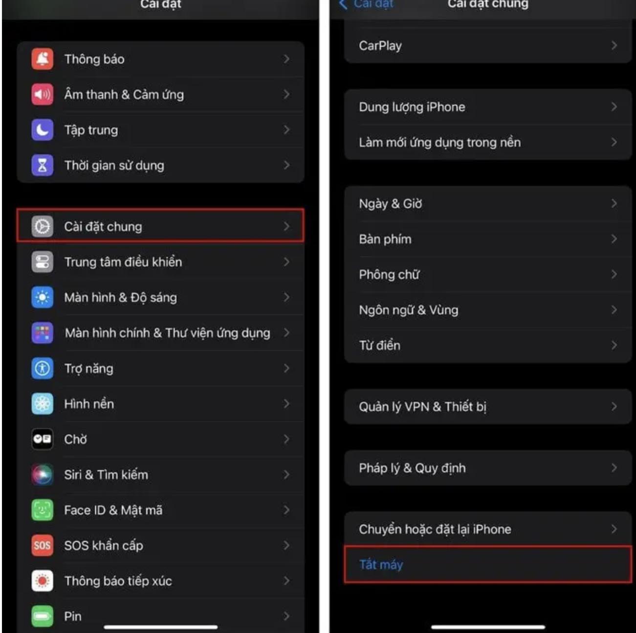 Đầu tiên, bạn truy cập vào "Cài đặt" của máy, chọn vào mục "Cài đặt chung", sau đó bạn vuốt xuống cuối cùng và chọn vào "Tắt máy". Tiếp theo bạn vuốt ngang "Trượt" để tắt nguồn là xong.