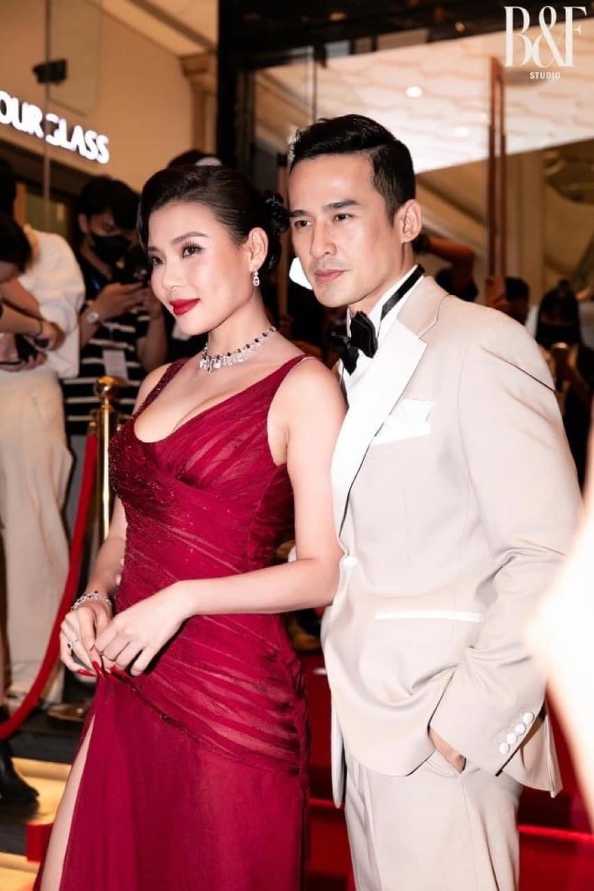Nữ diễn viên Thúy Diễm và chồng nhanh chóng thu hút sự chú ý khi xuất hiện trong show "Giai nhân" của NTK Đỗ Long. Cô lựa chọn đầm dạ hội màu đỏ rực, xẻ cổ chữ V khoe khéo vòng 1 đầy đặn.