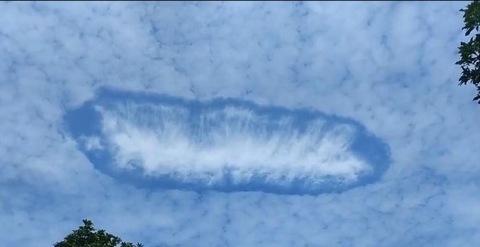 Đoạn phim ghi lại cảnh tượng này nhanh chóng lan truyền, thu hút sự chú ý của cả giới khoa học lẫn công chúng. Lỗ mây, hay còn gọi là cavum, xuất hiện như một khoảng trống hình elip giữa những đám mây trắng, tạo nên cảnh tượng huyền ảo giữa bầu trời xanh thẳm. (Ảnh cắt từ clip)