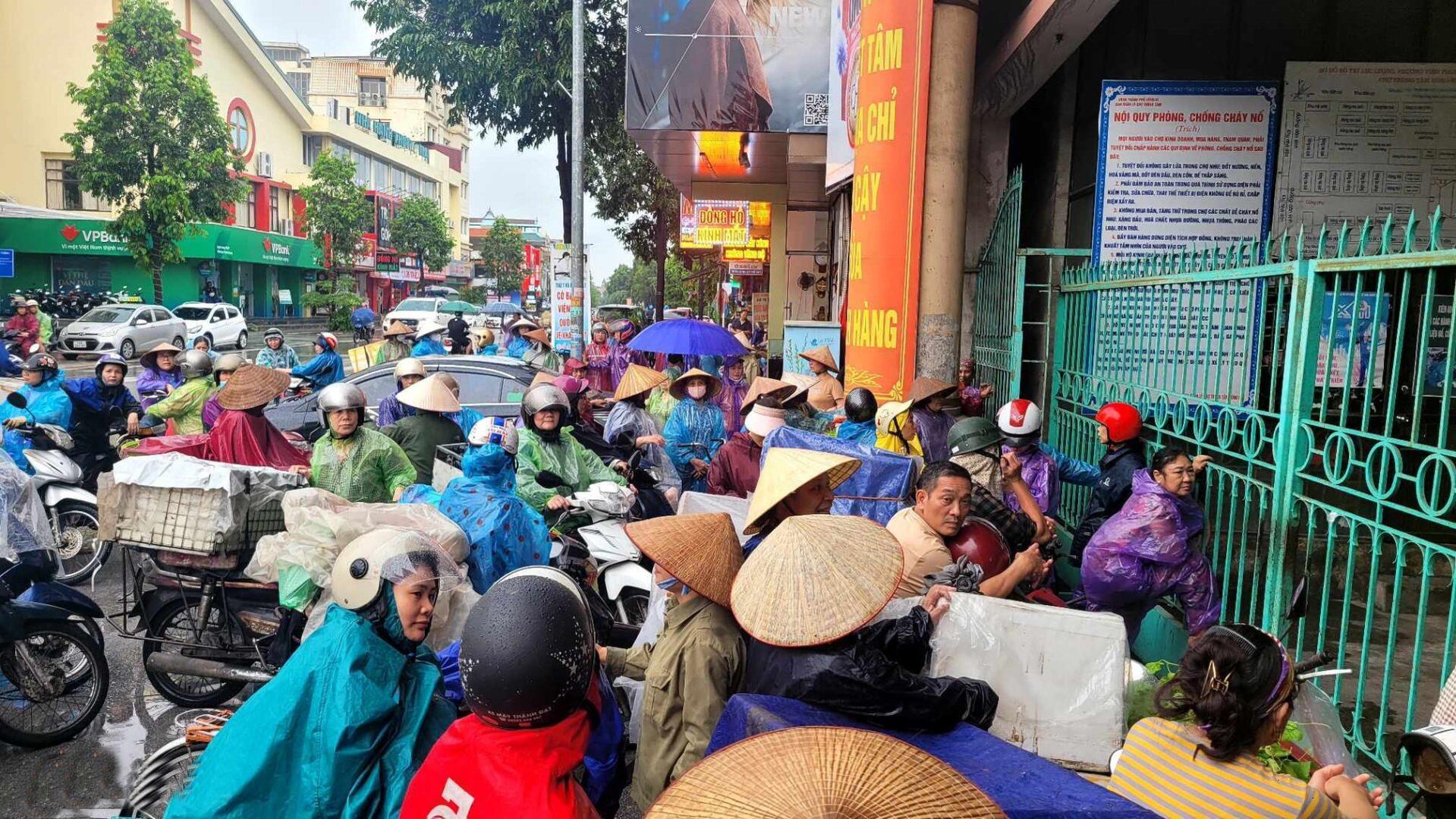 Hàng trăm tiểu thương đứng kín ba cổng chợ ngóng vào những gian hàng bị nước lũ xáo trộn, bừa bộn bên trong. Một số tiểu thương mang hàng đến chợ phải bày ra đường và vỉa hè cạnh chợ để bán.