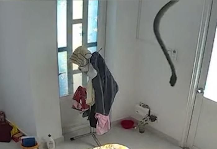 Qua hình ảnh từ camera, con rắn to lớn từ từ chuyển động, treo lủng lẳng trên tường khiến chàng trai sợ hãi.