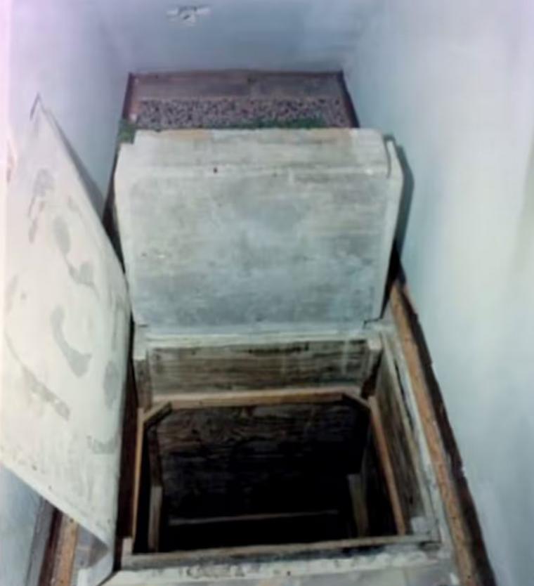 Dưới hai lớp thảm trải sàn là cánh cửa bằng bê tông nặng 90 kg mở ra lối vào đường hầm dài 180 cm, cửa này lại được che đậy sau một tủ sách có thể tháo rời trong văn phòng của Esposito.