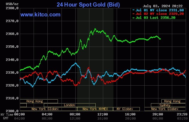Chốt phiên giao dịch 3/7, mỗi ounce vàng thế giới giao ngay ở 2.355 USD, mức cao nhất kể từ ngày 21/6. Sang phiên 4/7, giá vàng vẫn tiếp tục đi lên, hiện đứng tại 2.357 USD.