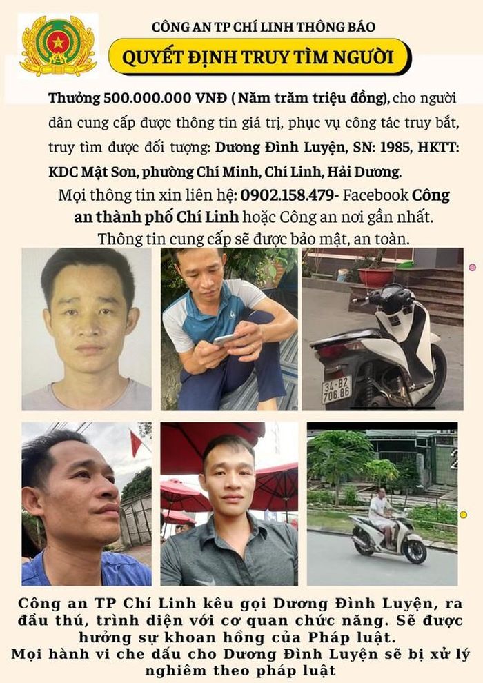Công an TP Chí Linh vừa thông báo sẽ thưởng 500 triệu đồng cho người dân cung cấp thông tin có giá trị, phục vụ công tác truy tìm, truy bắt được đối tượng Dương Đình Luyện (SN 1985, trú tại khu dân cư Mật Sơn, phường Chí Minh, TP Chí Linh), là nghi phạm sát hại bà L.T.H. (SN 1964) và chị Đ.T.G. (SN 1994), trú tại phường Văn Đức, TP Chí Linh.