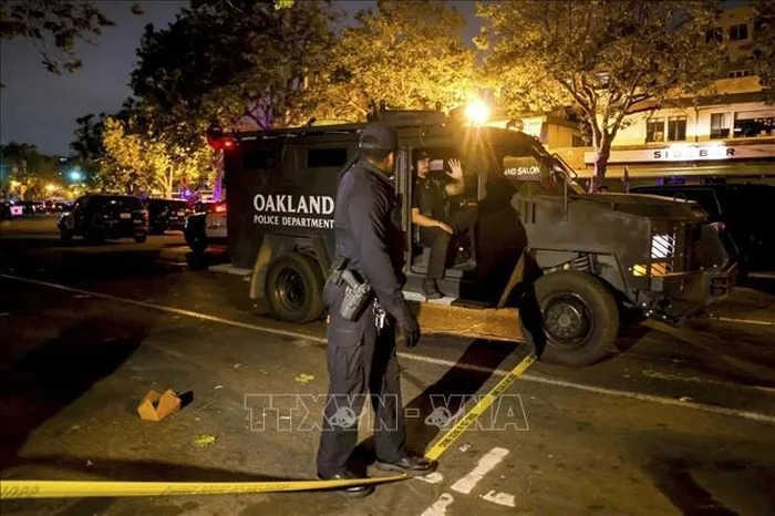 Cảnh sát phong tỏa hiện trường vụ nổ súng ở Oakland, bang California, Mỹ ngày 20/6/2024. Ảnh: AP/TTXVN