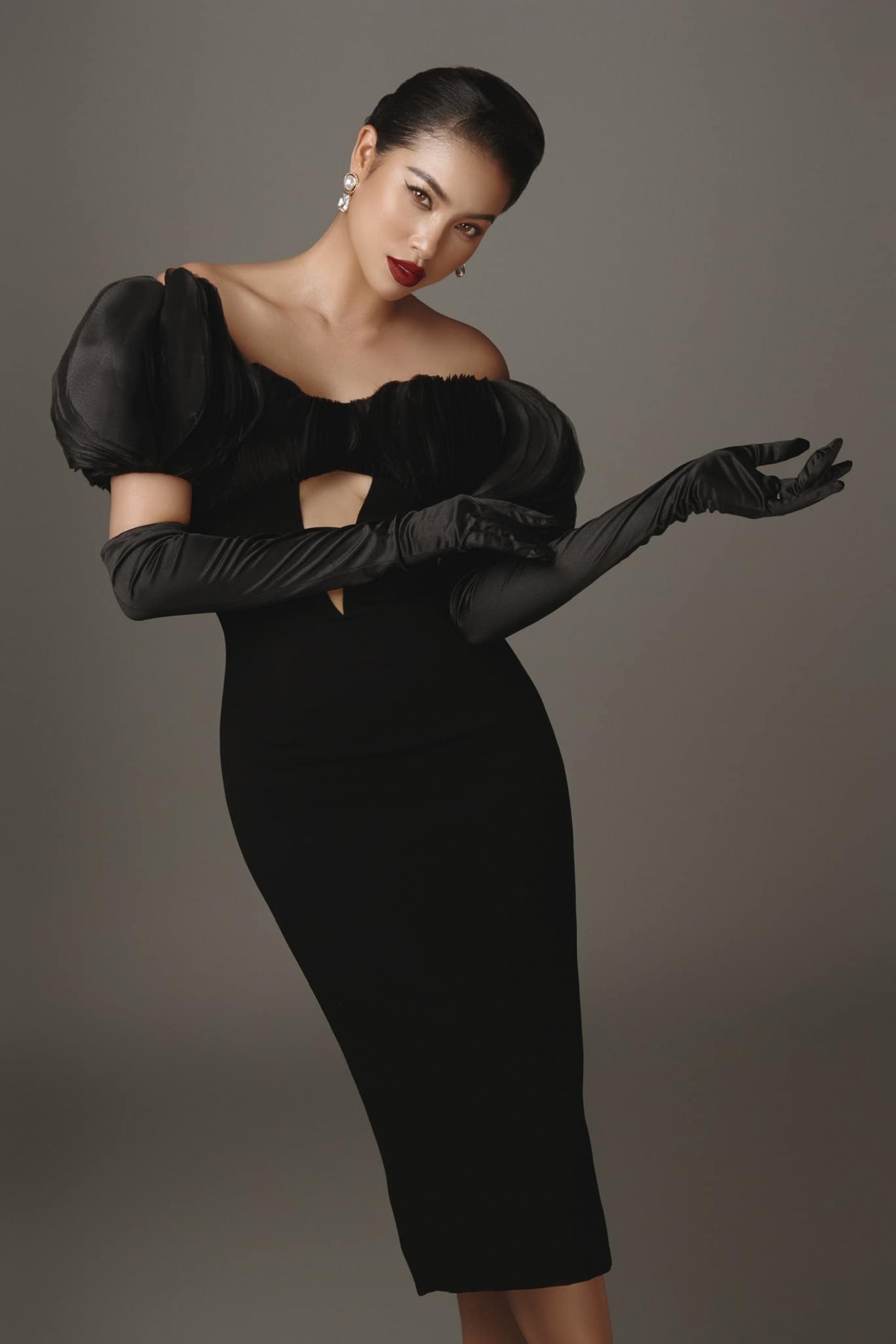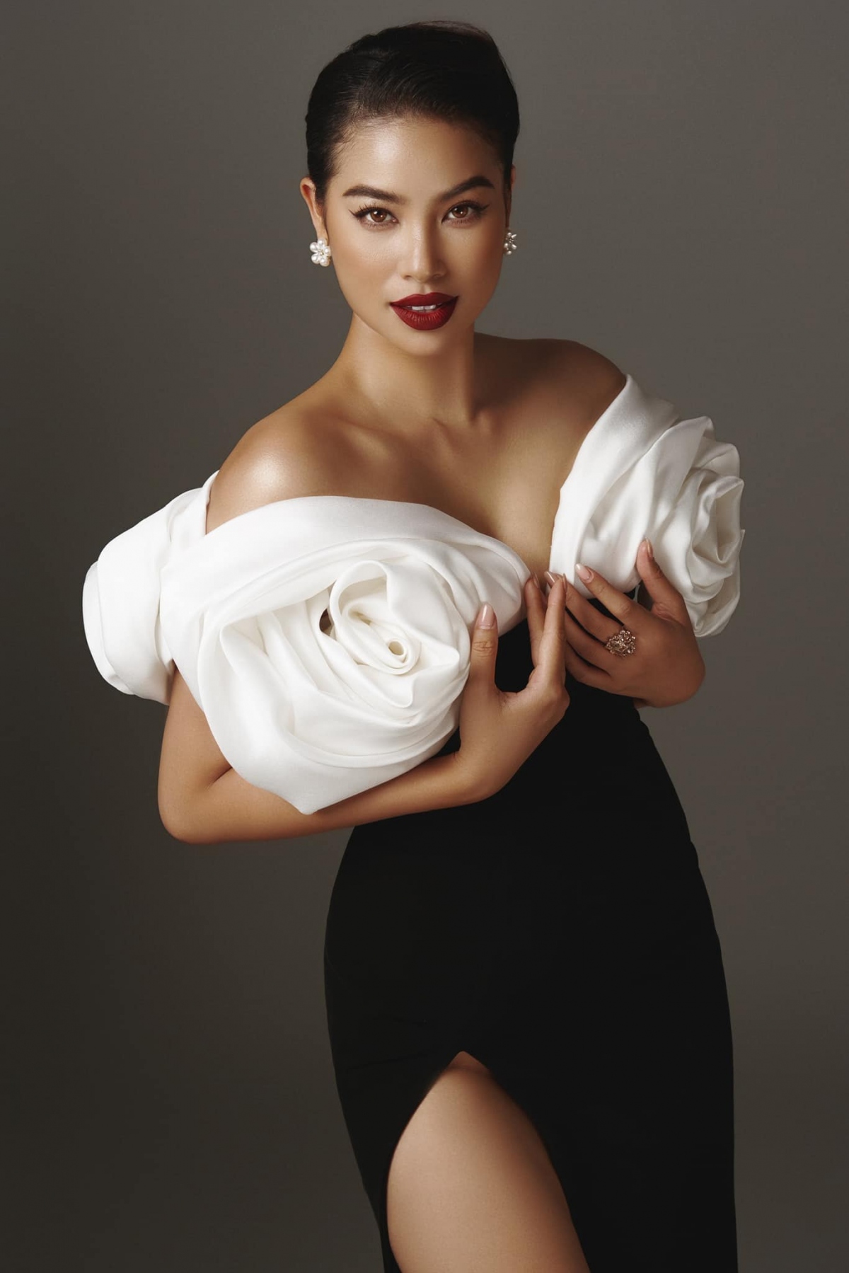 Phạm Hương diện mẫu váy dài, xẻ tà cao, trễ vai khoe trọn đôi chân dài và bờ vai thanh mảnh. Thiết kế màu trắng tinh khôi giúp tôn lên vẻ đẹp nhẹ nhàng, thanh lịch và quư phái của người đẹp, trong khi màu đen mang đến sự huyền bí.