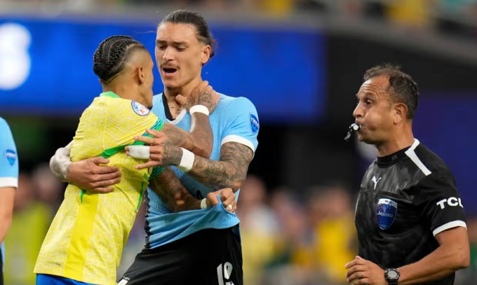 Trong hiệp hai, hai đội thậm chí tạo ít cơ hội hơn. Khán giả trên sân Allegiant la ó khi trận đấu liên tục gián đoạn. Đến cả Vinicius Junior, khi theo dõi đồng đội thi đấu trên khán đài, cũng không tránh khỏi cảm giác buồn chán mà phải lấy điện thoại ra dùng. Phút 74, lợi thế quân số đến với Brazil, nhưng họ cũng không thể tận dụng điều đó mà ghi bàn. Uruguay thì tìm mọi cách câu giờ để đưa trận đấu đến loạt luân lưu, bởi ngoài chung kết, Copa America 2024 không tổ chức đá hiệp phụ.