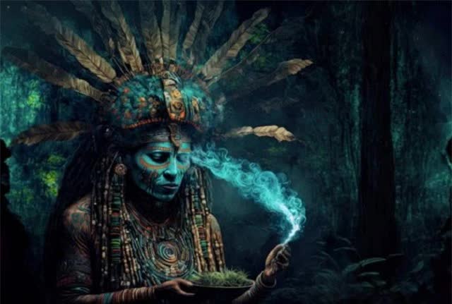 H́nh minh họa AI về một Shaman dẫn đầu buổi lễ ayahuasca linh thiêng