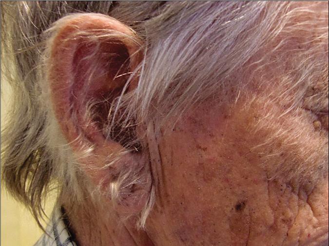 Lông tơ mọc dày ở tai của một người bệnh ung thư. Ảnh: IJDVL