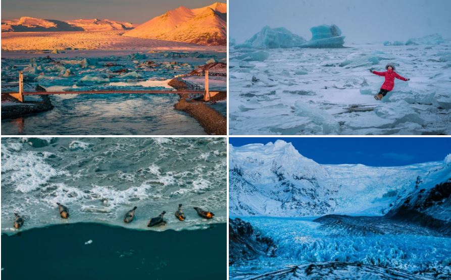 Dưới ánh mặt trời, những tảng băng lấp lánh như những viên ngọc tuyệt đẹp, xa xa là khung cảnh những núi tuyết trắng xóa trên nền trời ửng hồng đẹp tựa bức tranh. Men theo lối đi bộ đường dài, chúng tôi nhìn ngắm khung cảnh rộng lớn, huyền ảo cùng những chú hải cẩu đáng yêu đang lăn lộn trên băng.
