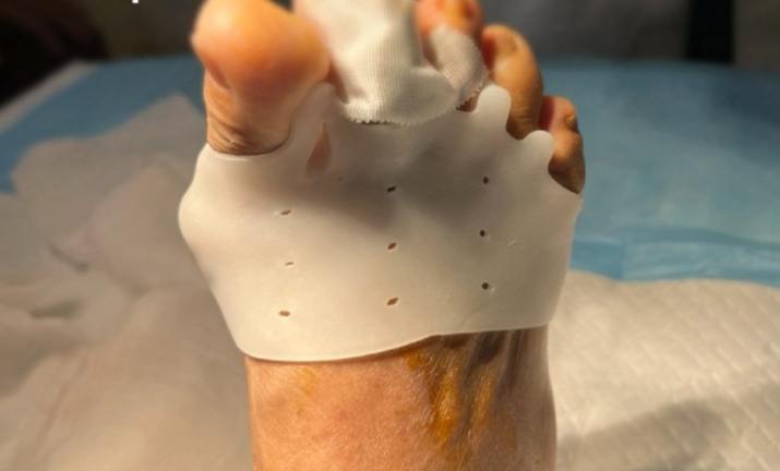 Người bệnh bị biến dạng bàn chân được đeo nẹp silicon mềm, dẻo. Ảnh: BVCC
